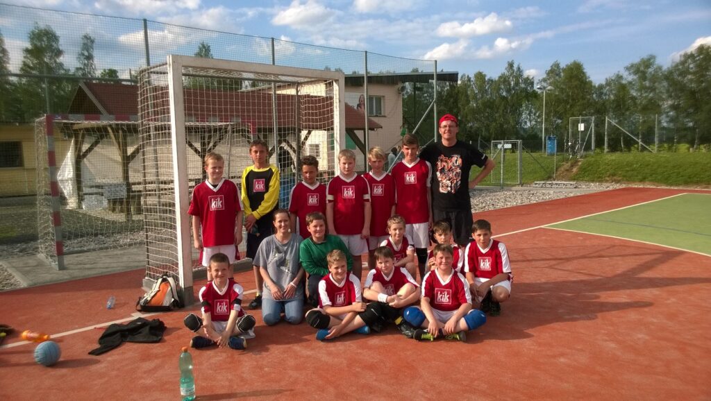 Zleva stojí: Honza Šmrha, Šimon Jung, Honza Nosek, Matěj Pittr, Ondra Sedláček, Martin Havlíček, Daniel Havlíček (trenér)
