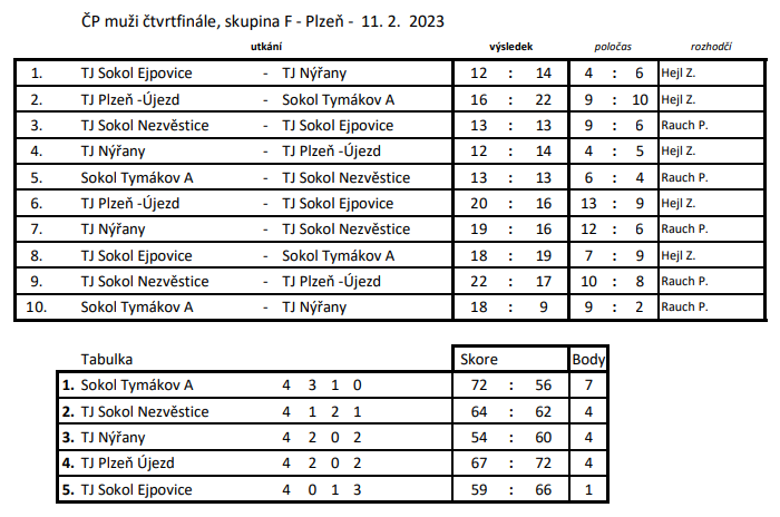 V sobotu jsme hráli čtvrtfinále českého poháru. Po remízách 13:13 s Ejpovicemi a Tymákovem, jsme prohráli s Nýřany 16:19 a nakonec výhra s Plzeň-Újezd 22:17. Takže jsme nakonec postoupili do Semifinále v minitabulce o jeden jediný gol 😮. My +2, Nýřany +1, Plzen ujezd -3.