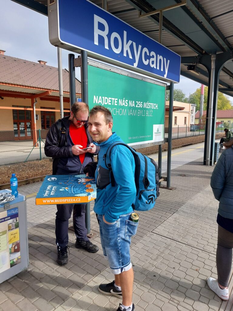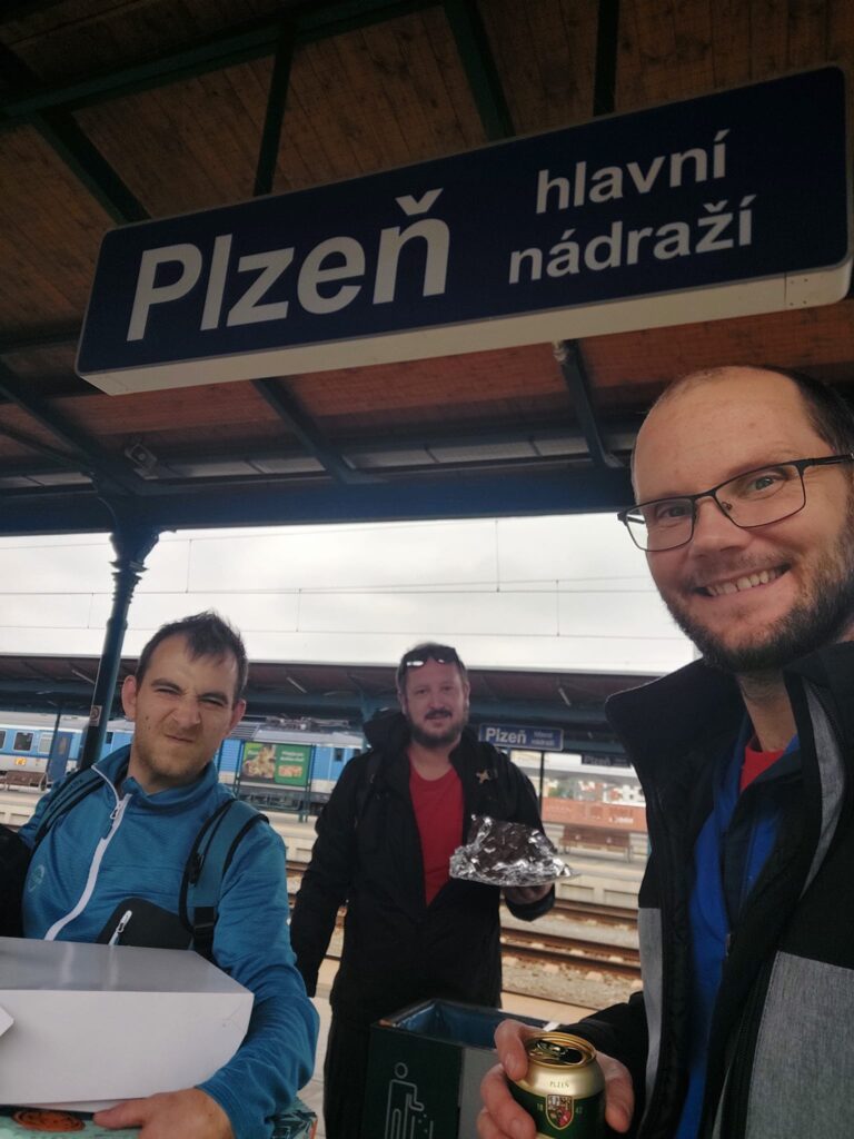 Následně sestavu plánovaně opustil Sláveček a nás čekala cesta vlakem na odpolední utkání do Plzně. Ještě, že nás alespoň odvezl do Rokycan na vlak. Bez normálního oběda, bez kořalek, s krabicí pizzy a chlebíčků (ta byla jako odškodné od Slávečka za odpolední absenci) osobákem na hlavák. S Hodem jsme tedy dali ve vlaku jedno „v plechu“. Cestou jsem vzpomínal, kdy jsem naposledy absolvoval cestu vlakem až do Plzně. V cílové stanici jsem byl tak trochu v šoku, protože na hlavním nádraží v Plzni jsem nebyl minimálně 10 let. Tady jsem ale zjistil, že na mě mí drazí spoluhráči ušili pěkný podraz. Nejedeme tramvají, ale jdeme pěšky! Bohužel mám krátké vedení, takže mi ta „bouda“ ráno vůbec nedocvakla. Všichni jeli nalehko s batohem, Váša dokonce bez papírového pytle. Já v plné polní, včetně 3 litrů vody (přece jí nebudu vylívat) a krabice chlebíčků. Normálně by se řeklo, že to je hezká procházka, ale takhle... Do Klášterní se mi tak vůbec hezky nešlo.