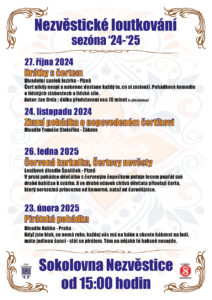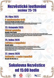 Program nastávajícího ročníku Nezvěstického loutkování. 26. října 2025, 23. listopadu 2025, 25. ledna 2026, 22. února 2026 od 15:00 hodin v Sokolovně.